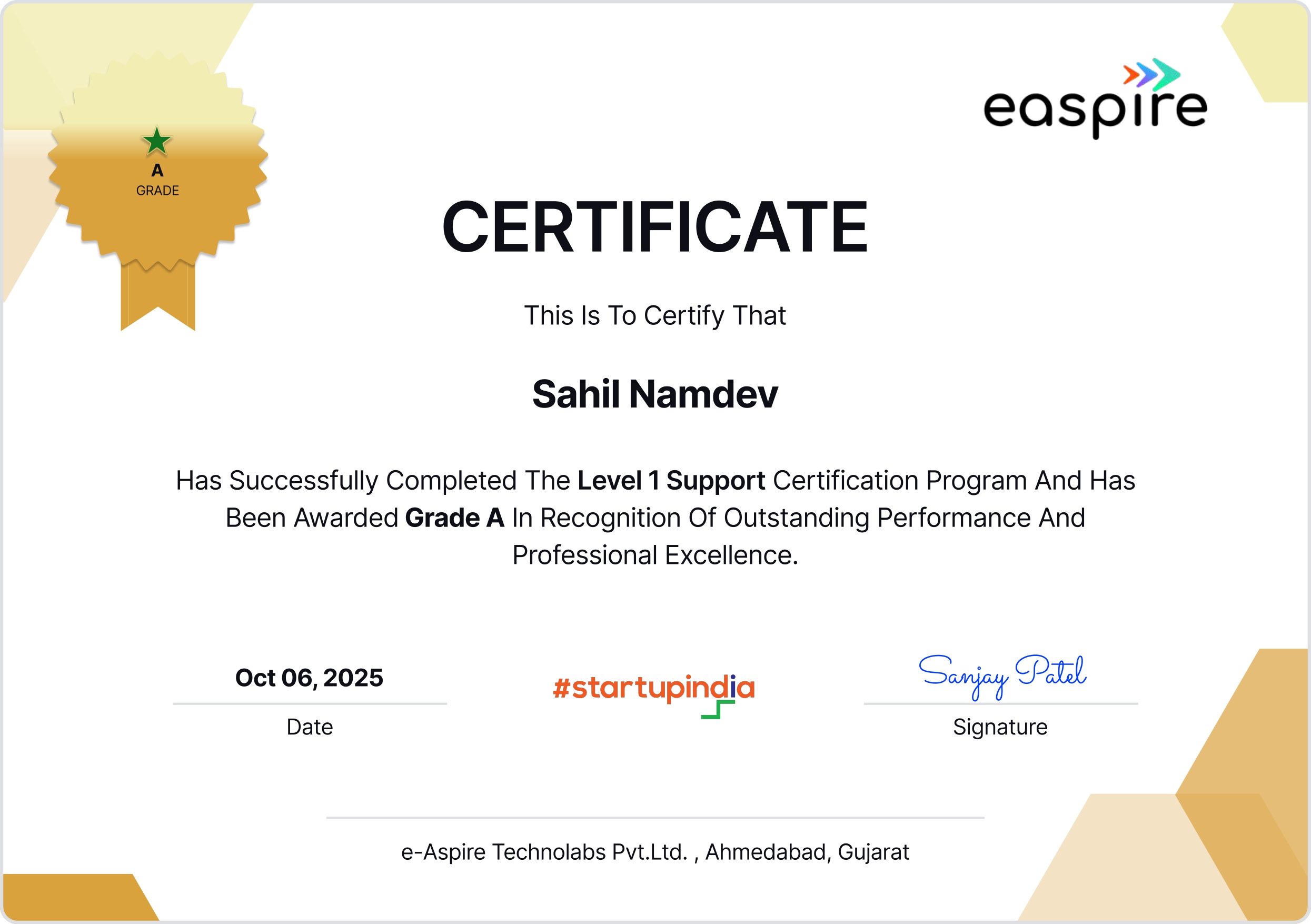 "This certification demonstrates my foundational knowledge of IT support, including troubleshooting, system handling, and user assistance. I achieved a Grade A, reflecting strong problem-solving skills, technical understanding, and professional work practices. The program helped me build confidence in handling real-world support scenarios and working effectively in a technical environment."